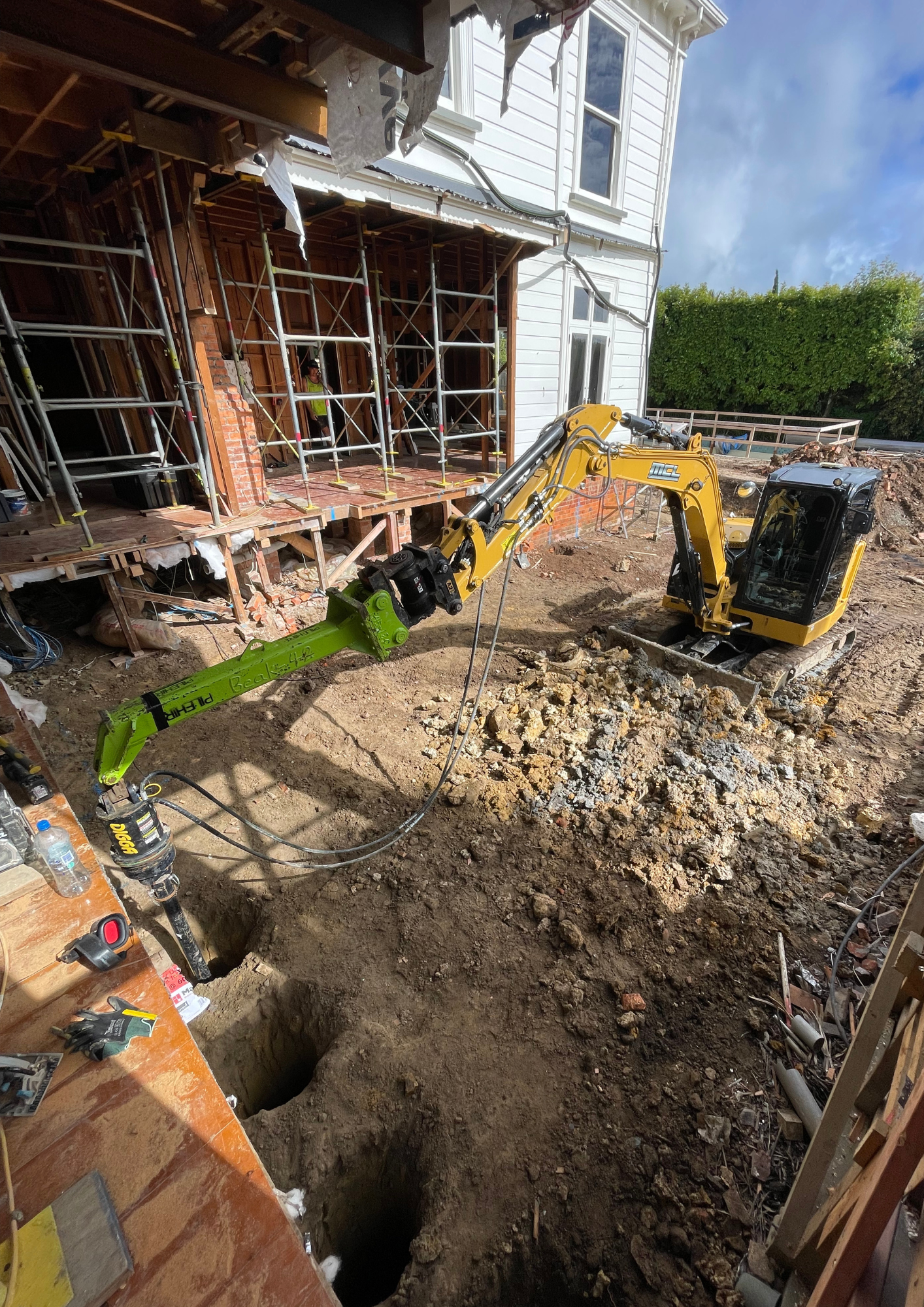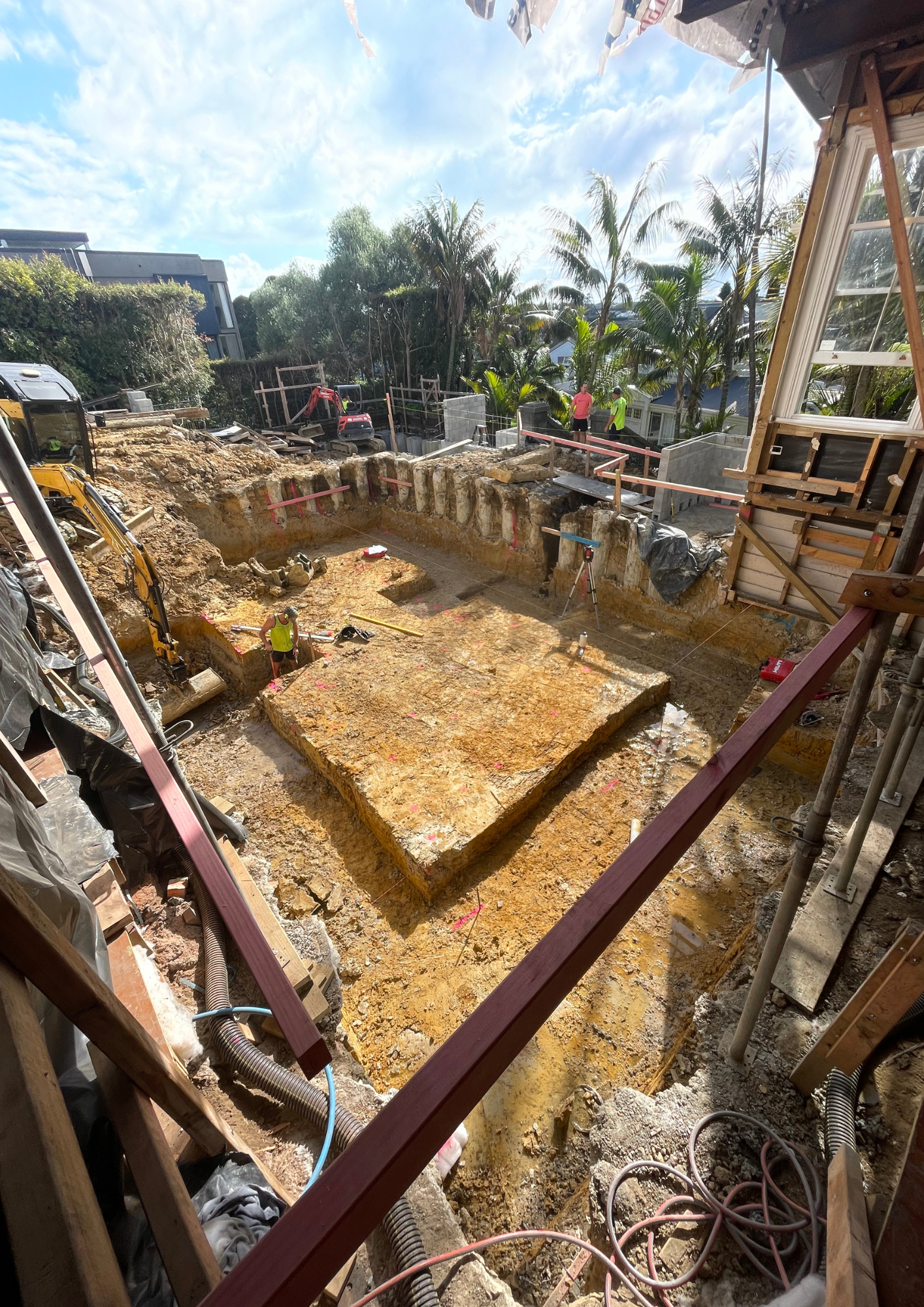 We began by excavating and installing retaining to create safe access. From there, we drilled soldier piles to surround the basement area, then carefully dug out between them to form a secure foundation. All material was carted through and around the existing house before being loaded out, no small task on a restricted residential site.