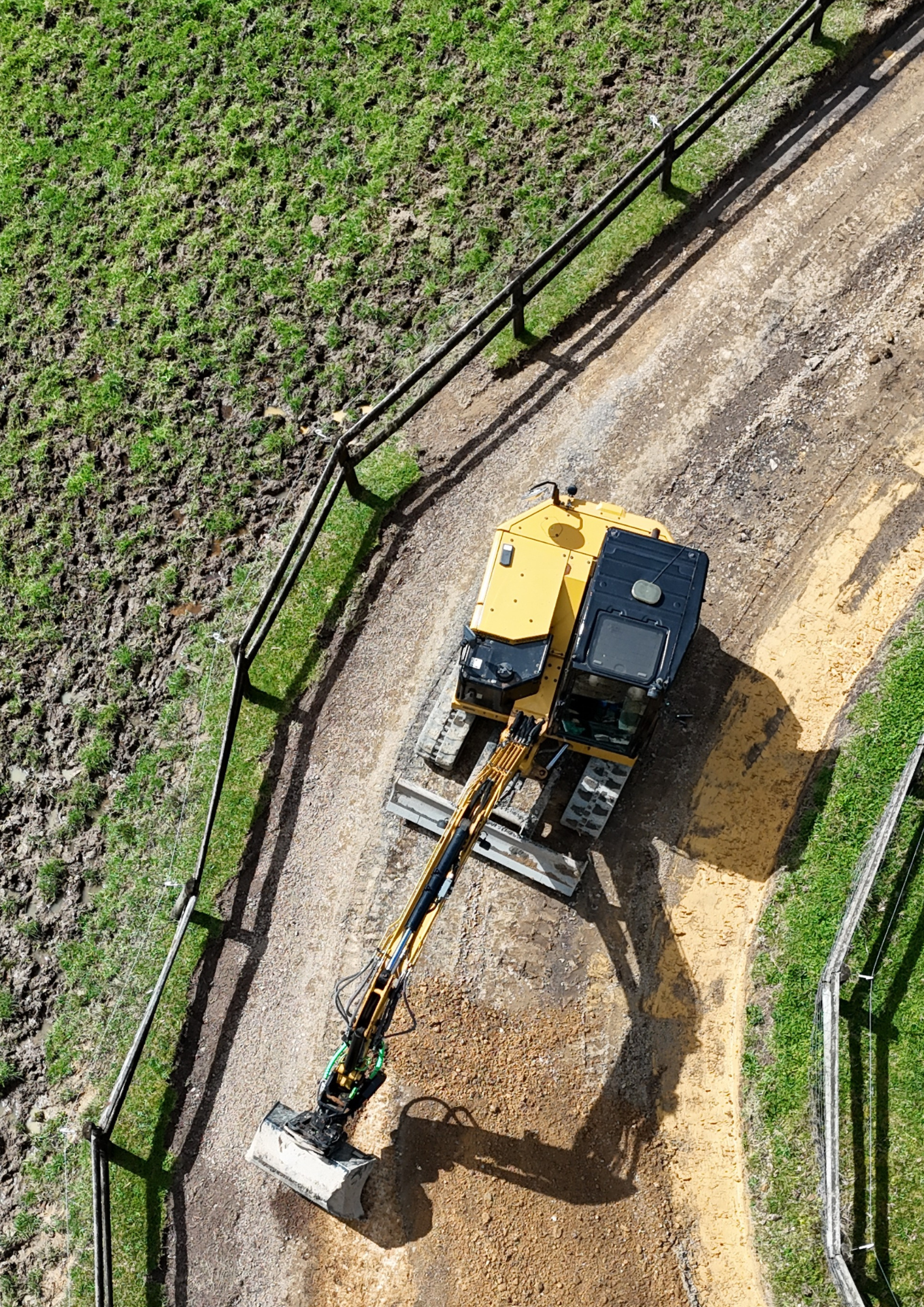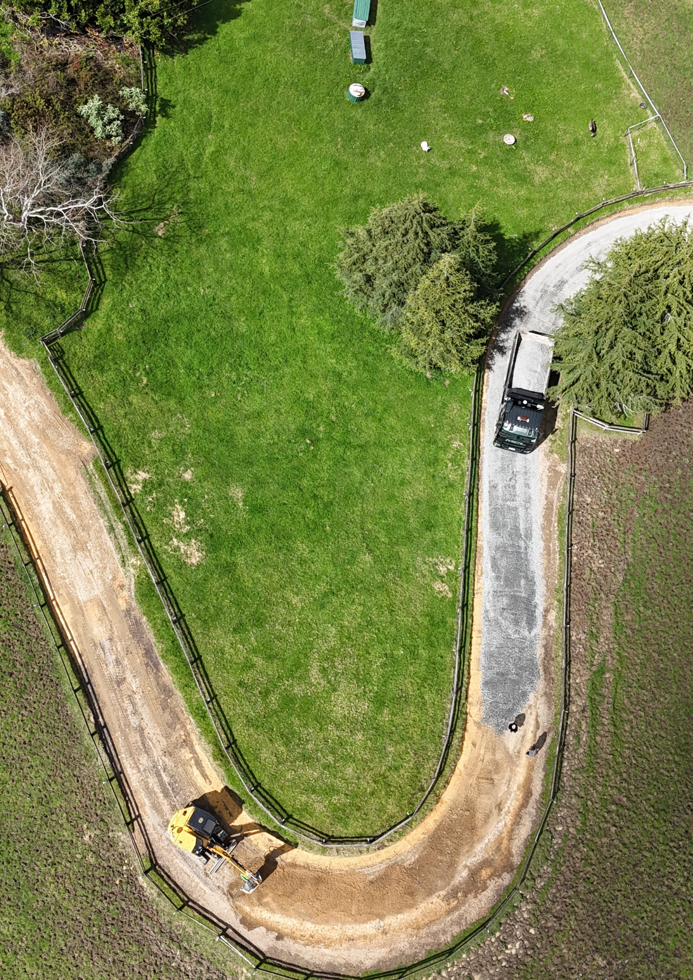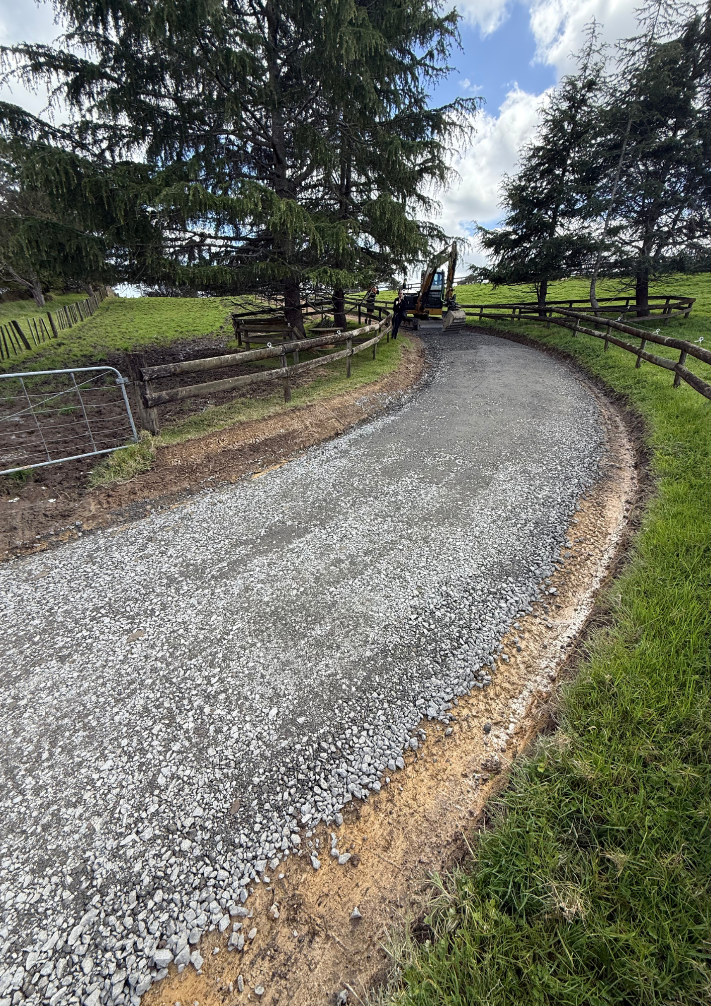We widened sections of the existing track and reformed watertables along both sides to direct water away from the driving surface. Once the drainage was established, new metal was laid, shaped, and compacted to form a strong, even finish that will stand up to heavy use and wet weather.
